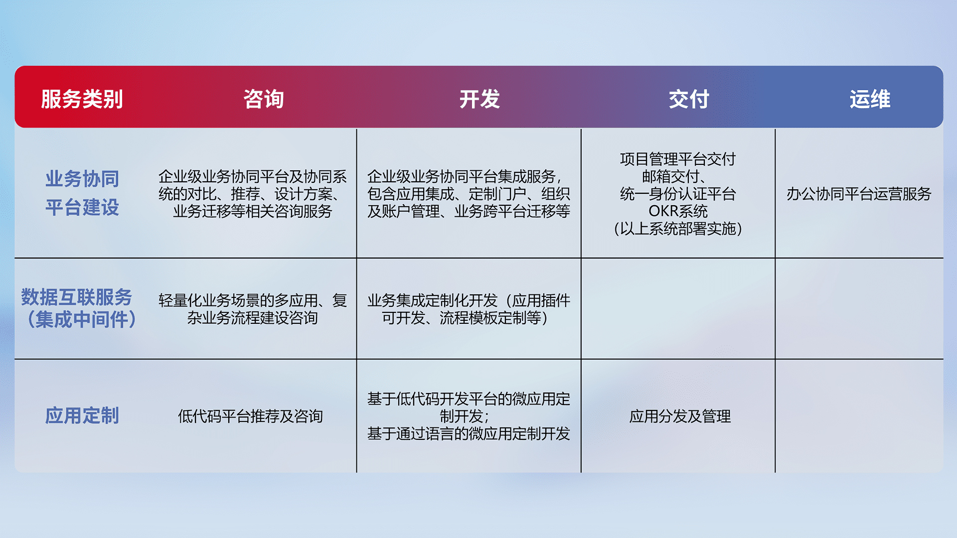 针对钉钉、、、企微、、、IDaas等平台级产品提供产品的规划、、、方案、、交付、、、定制化开发等服务,,,实现如统一协同办公、、、、智能客户服务、、、混合会议管理、、、、智能数据查询、、、、等业务场景,,实现数字化转型。。